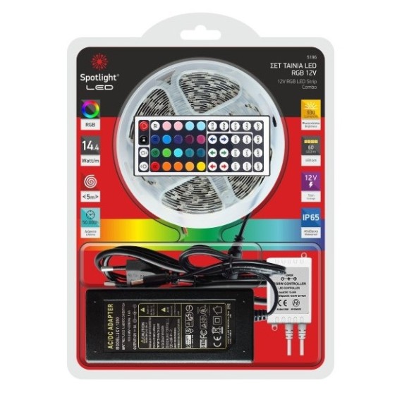 Έτοιμο κιτ με ταινία LED RGB, 12V, 14.4W/Μ., στεγανή, μήκους 5 μέτρων. Η συσκευασία περιλαμβάνει επίσης τηλεχειριστήριο και μετασχηματιστή ρεύματος.