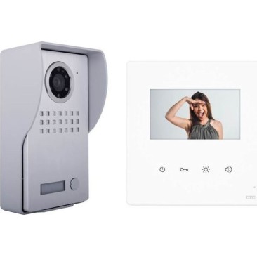 Σύστημα θυροτηλεόρασης 2 καλωδίων της εταιρίας CTC με έγχρωμη οθόνη 4,3 ιντσών σε λευκό χρώμα, ευρυγώνια κάμερα και αδιάβροχη μπουτονιέρα για επίτοιχη τοποθέτηση. Υποστηρίζει έως 4 εσωτερικές συσκευές ενδοεπικοινωνίας στην ίδια κλήση, ενώ επιπλέον παρέχει την δυνατότητα επέκτασης έως 4 μπουτονιέρες.