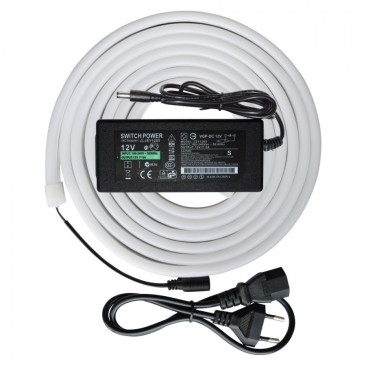 Έτοιμο κιτ με ταινία LED Neon FLEX, 12V, 10W/Μ., στεγανή, μήκους 3 μέτρων. Η συσκευασία περιλαμβάνει επίσης 1 x τερματική, 4 x στηρίγματα PVC με βίδες και μετασχηματιστή ρεύματος.