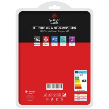Έτοιμο κιτ με ταινία LED θερμού φωτισμού, 12V, 14.4W/Μ., μήκους 5 μέτρων. Διαθέτει ισχυρό αυτοκόλλητο 3Μ για πιο εύκολη εγκατάσταση. Η συσκευασία περιλαμβάνει και τον μετασχηματιστή ρεύματος.