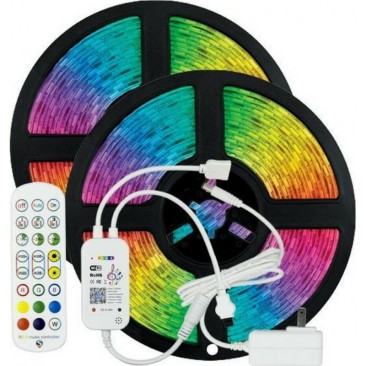 Έτοιμο κιτ με 2 ταινίες LED RGB, 12V, 7.2W/Μ., μήκους 5 μέτρων η κάθε μία. Η συσκευασία περιλαμβάνει επίσης τηλεχειριστήριο και μετασχηματιστή ρεύματος.