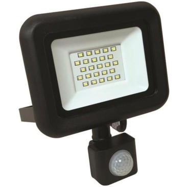 Στεγανός προβολέας LED SMD Eurolamp Plus 20W με βάση 360 μοιρών, σε μαύρο χρώμα, με ψυχρό φωτισμό και περιστρεφόμενο ανιχνευτή κίνησης. Διαθέτει δυνατότητα ρύθμισης ευαισθησίας στο φως της ημέρας.