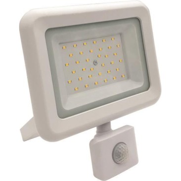 Στεγανός προβολέας LED SMD Eurolamp Plus 30W με βάση 360 μοιρών, σε λευκό χρώμα, με ψυχρό φωτισμό και περιστρεφόμενο ανιχνευτή κίνησης. Διαθέτει δυνατότητα ρύθμισης ευαισθησίας στο φως της ημέρας.