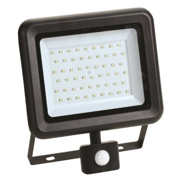 Στεγανός προβολέας LED SMD Eurolamp Plus 50W με βάση 360 μοιρών, σε μαύρο χρώμα, με φωτισμό ημέρας και περιστρεφόμενο ανιχνευτή κίνησης. Διαθέτει δυνατότητα ρύθμισης ευαισθησίας στο φως της ημέρας.
