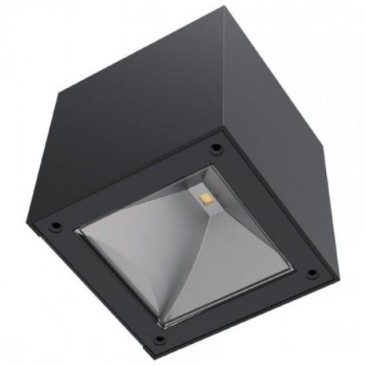 Επιτοίχιο ηλιακό φωτιστικό LED με σχήμα κύβου, σε μαύρο χρώμα, με θερμό φως, διακόπτη on/off και ενσωματωμένο panel τροφοδοσίας.