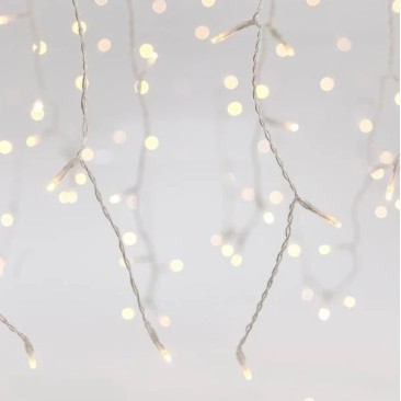 144 LED θερμά λευκά, 3 μέτρα x 60 εκατοστά τύπου "βροχή" με μετασχηματιστή, διαφανές καλώδιο και προέκταση παροχής 300 εκατοστά. Έχει υψηλό βαθμό στεγανότητας (IP44) ώστε να μπορεί να χρησιμοποιηθεί και σε εξωτερικό χώρο.