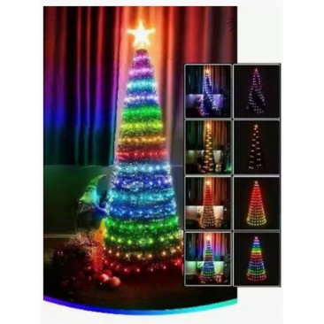 Κουρτίνα 200 x 200 εκατοστά με 756 RGBW smart mini led, μετασχηματιστή 5V και προέκταση παροχής 5 μέτρα. Διαθέτει διάφορα προγράμματα εναλλαγής φωτισμού και σχεδίων των οποίων ο έλεγχος γίνεται μέσω εφαρμογής.