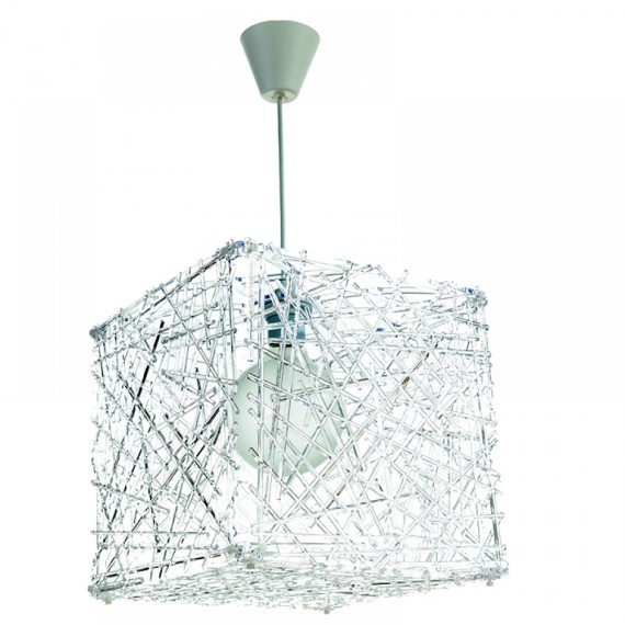 Κρεμαστό φωτιστικό από plexiglass σε σχήμα κύβου, διάφανο με λευκή ανάρτηση. Έχει την δυνατότητα αυξομείωσης ύψους μέσω του καλωδίου ανάρτησης που διαθέτει. (Η λάμπα δεν συμπεριλαμβάνεται στην συσκευασία).