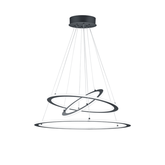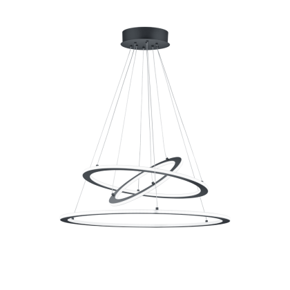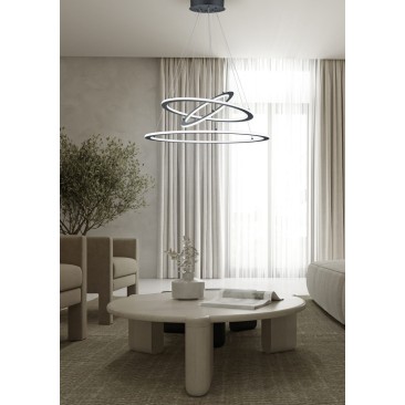 Κρεμαστό φωτιστικό LED εσωτερικού χώρου υψηλής αισθητικής με θερμό φωτισμό και δυνατότητα ρύθμισης φωτεινότητας τριών επιπέδων (100%-50%-25%) με έναν κοινό διακόπτη. Το φωτιστικό αποτελείται συνολικά από τρείς δακτυλίους με τον μεγαλύτερο από από αυτούς να έχει διάμετρο 80 εκατοστά και τους δυο μικρότερους να έχουν διάμετρο 60 και 40 εκατοστά αντίστοιχα, ενώ υπάρχει η δυνατότητα ρύθμισης του ύψους του συνολικά.