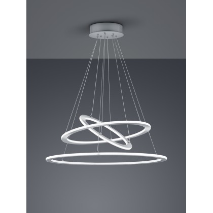 Κρεμαστό φωτιστικό LED εσωτερικού χώρου υψηλής αισθητικής με θερμό φωτισμό και δυνατότητα ρύθμισης φωτεινότητας τριών επιπέδων (100%-50%-25%) με έναν κοινό διακόπτη. Το φωτιστικό αποτελείται συνολικά από τρείς δακτυλίους με τον μεγαλύτερο από από αυτούς να έχει διάμετρο 80 εκατοστά και τους δυο μικρότερους να έχουν διάμετρο 60 και 40 εκατοστά αντίστοιχα, ενώ υπάρχει η δυνατότητα ρύθμισης του ύψους του συνολικά.