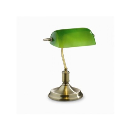 Επιτραπέζιο φωτιστικό γραφείου με μεταλλική βάση σε μπρούτζινο χρώμα, πράσινο καπέλο από γυαλί και καλώδιο ρεύματος με διακόπτη. Δέχεται λάμπα τύπου E27 (δεν περιλαμβάνεται στη συσκευασία).