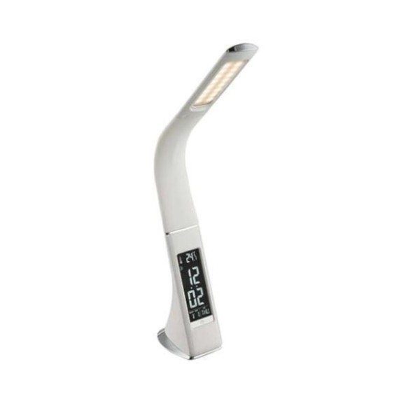 Φωτιστικό γραφείου με ενσωματωμένο LED και ψηφιακή οθόνη με ενδείξεις θερμοκρασίας, ημερομηνίας και ώρας. Με ευλύγιστο κορμό για εύκολη προσαρμογή του φωτός στην επιθυμητή θέση. Διαθέτει καλώδιο τροφοδοσίας USB και αντάπτορα ρεύματος.