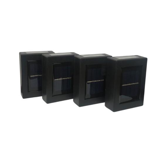 Σετ με 4 επιτοίχια ηλιακά φωτιστικά LED σε μαύρο χρώμα, με θερμό φως, φωτισμό διπλής κατεύθυνσης (πάνω-κάτω), διακόπτη on/off και ενσωματωμένο panel τροφοδοσίας.