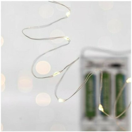 20 λαμπάκια led σε σειρά μήκους 1.9m και προέκταση παροχής 10cm. Έχουν ασημί καλώδιο και εκπέμπουν θερμό λευκό φως, του οποίου οι τόνοι είναι πιο κίτρινοι σε σχέση με το φυσικό φως. Διαθέτουν βαθμό προστασίας IP20, που δεν επιτρέπει την άμεση επαφή των δαχτύλων μας με τα φωτιστικά στοιχεία. Λειτουργούν με μπαταρίες 3 x ΑΑ.