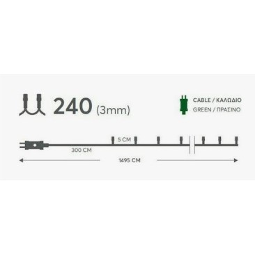 Σειρά με 240 Χριστουγεννιάτικα λαμπάκια led της Eurolamp μήκους 11.95m, πάχους 3mm, 31V, μετασχηματιστή με μνήμη, 8 προγράμματα και προέκταση παροχής 300cm. Εκπέμπουν φως σε κόκκινο χρώμα και έχουν πράσινο καλώδιο. Διαθέτουν βαθμό προστασίας IP44, που δηλώνει ότι δεν μπορούν να εισχωρήσουν στερεά αντικείμενα άνω του ενός χιλιοστού αλλά ούτε και νερό με μεγάλη ένταση.