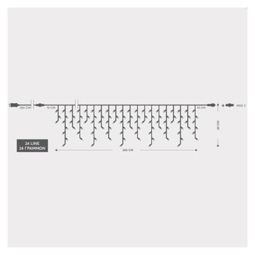 144 LED θερμά λευκά, 3 μέτρα x 60 εκατοστά τύπου "βροχή" με μετασχηματιστή, διαφανές καλώδιο και προέκταση παροχής 300 εκατοστά. Έχει υψηλό βαθμό στεγανότητας (IP44) ώστε να μπορεί να χρησιμοποιηθεί και σε εξωτερικό χώρο.