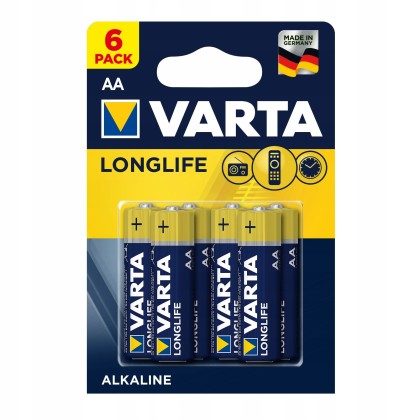 Αλκαλικές Varta Longlife μεγέθους ΑΑ με μεγάλη διάρκεια ζωής, ιδανικές για τηλεχειριστήρια, φακούς, ξυπνητήρια και άλλες μικροσυσκευές. Η συσκευασία περιλαμβάνει 6 τεμάχια.